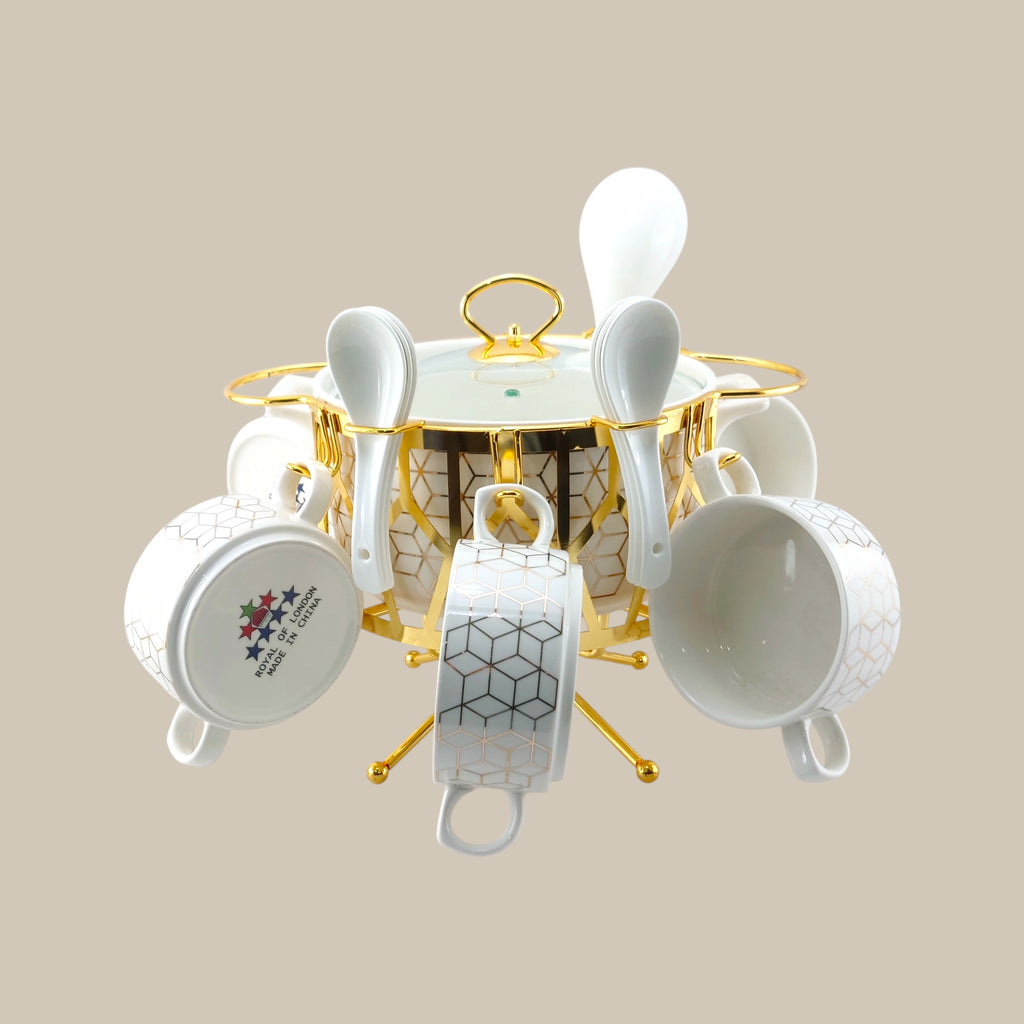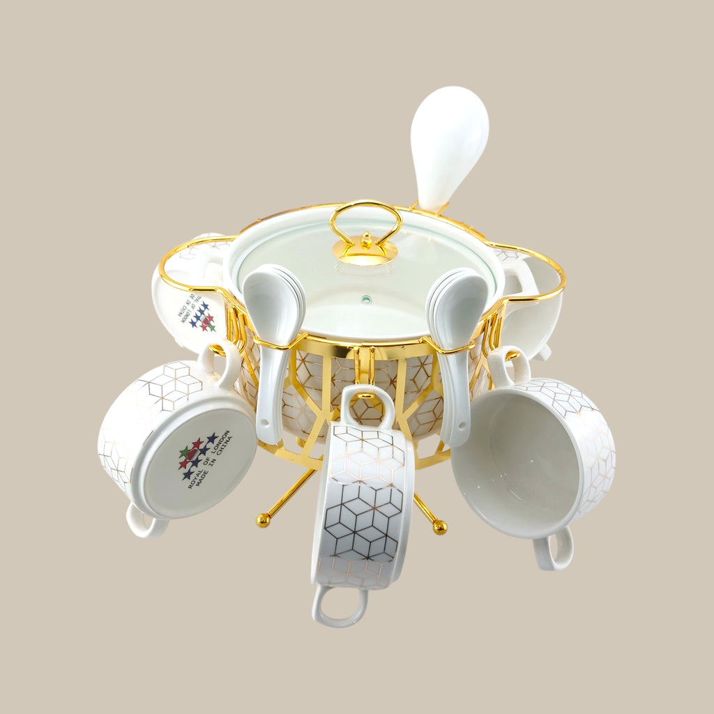 Elevate your dining experience with the Royale 16-Piece Soup Set, a sophisticated collection designed for refined entertaining. This comprehensive set features one elegant soup bowl with matching lid and spoon, complemented by six smaller soup bowls, each accompanied by its own delicate spoon. The striking golden stand serves as both a functional serving piece and an elegant centerpiece, adding a touch of luxury to your table. Perfect for formal dinners, special occasions, or everyday sophistication, this set combines practicality with timeless elegance for the discerning host.