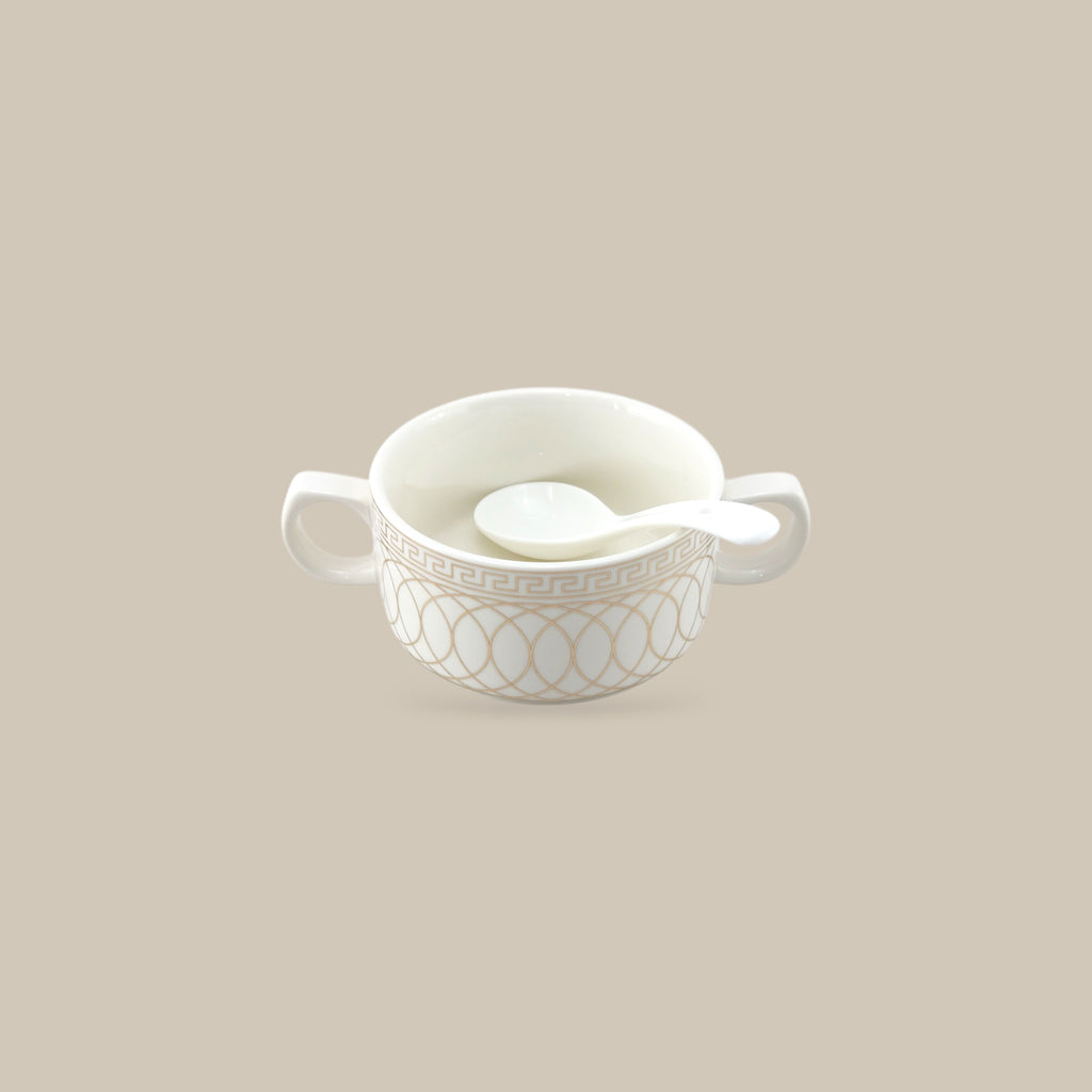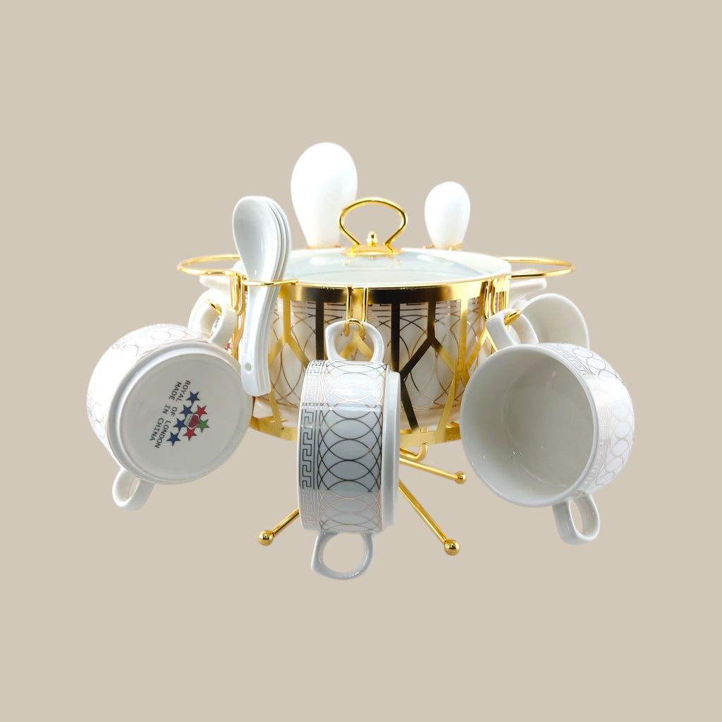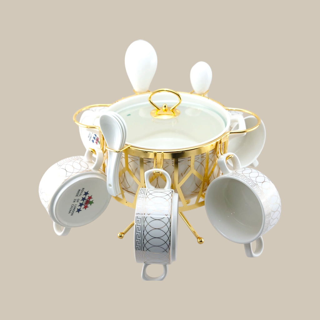 Elevate your dining experience with the Royal 16-Piece Soup Set, a sophisticated collection designed for refined entertaining. This comprehensive set features one elegant soup bowl with matching lid and spoon, complemented by six smaller soup bowls, each accompanied by its own delicate spoon. The striking golden stand serves as both a functional serving piece and an elegant centerpiece, adding a touch of luxury to your table. Perfect for formal dinners, special occasions, or everyday sophistication, this set combines practicality with timeless elegance for the discerning host.