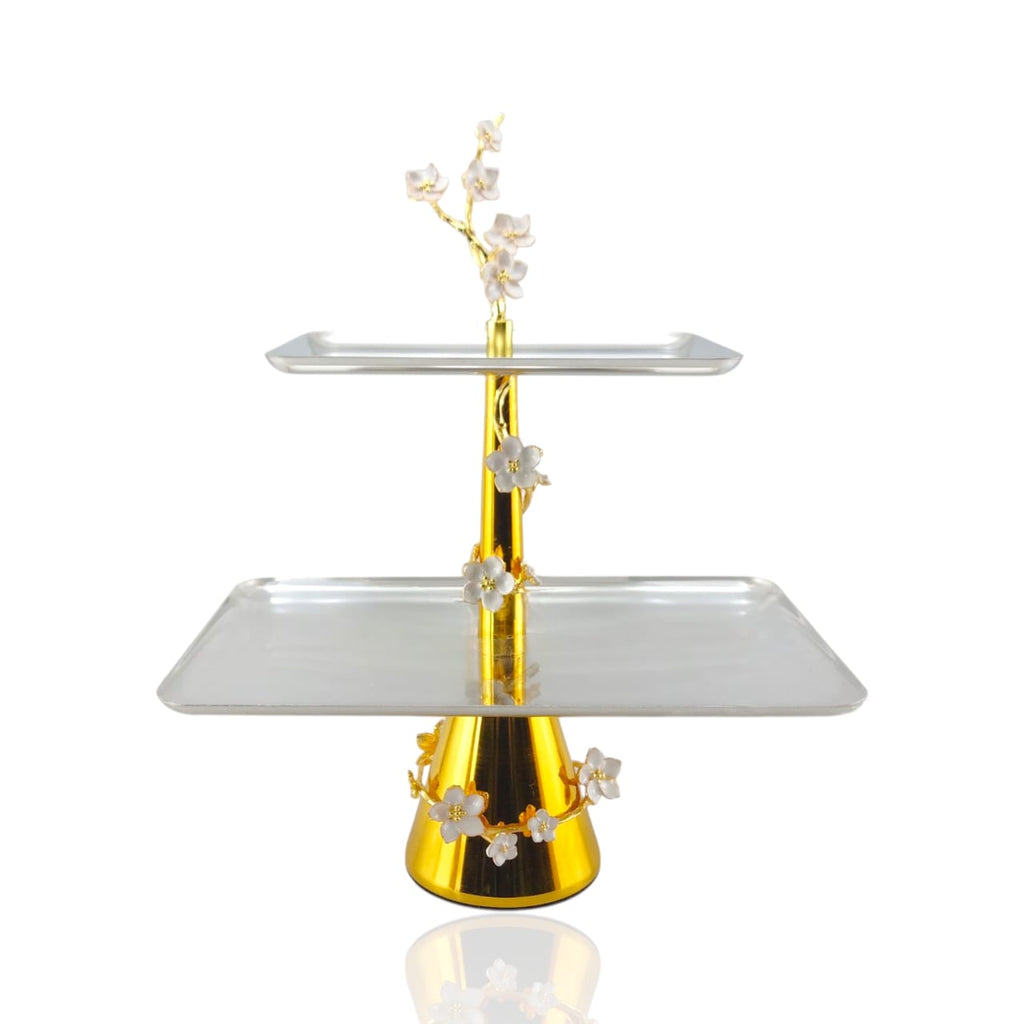 Elevate your dessert presentation with this 2-tier fancy stainless steel dessert stand. Featuring a stylish flower motif on the top tier, it offers ample space for serving cupcakes, pastries, and other treats. The golden base adds a touch of elegance, while the cushioned bottom protects your table from scratches, ensuring both beauty and functionality for your gatherings.