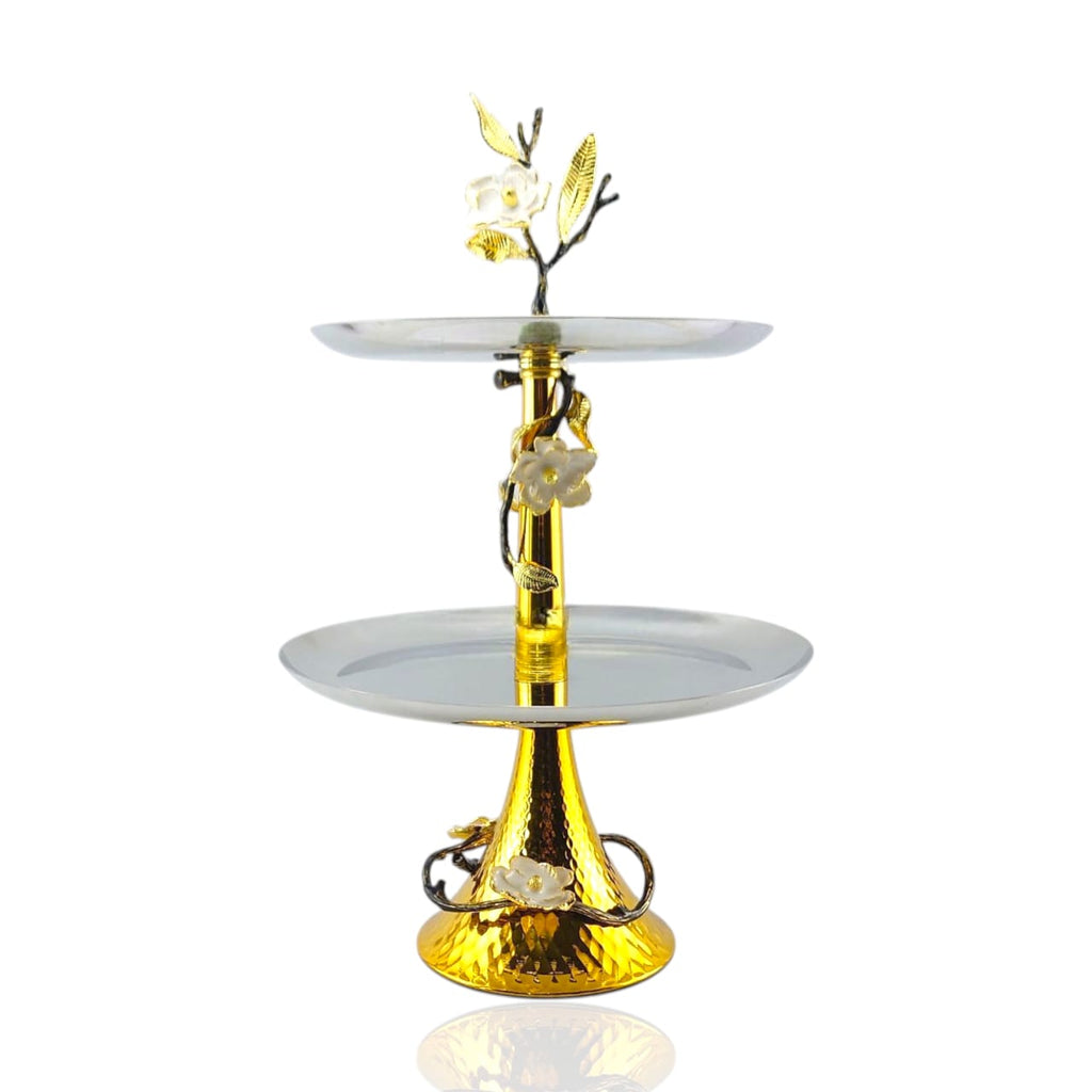 Crafted from durable stainless steel, this 2-Tier Fancy Round Dessert Stand is designed to elegantly display pastries, cupcakes, and other desserts. Adorned with intricate flower motifs on the top, middle, and base, it adds a refined decorative touch while offering sturdy support. Its tiered structure optimizes space, making it ideal for both intimate gatherings and upscale events.