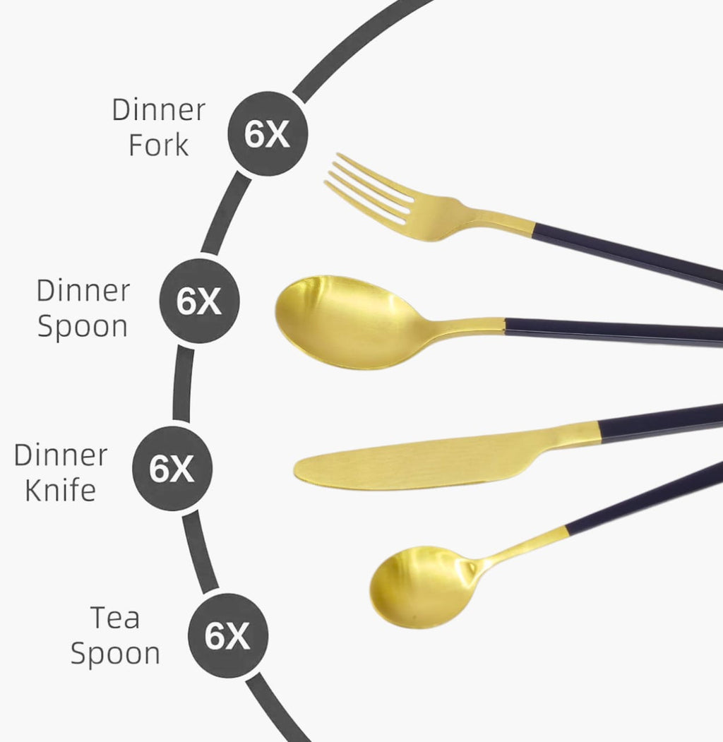 This 24-piece Alomi cutlery set combines sleek black with elegant golden accents to enhance your dining experience. Crafted from durable stainless steel, it includes 6 dinner forks, 6 dinner spoons, 6 dinner knives, and 6 tea spoons, offering complete tableware for six people. Its balanced design ensures comfortable handling, while the sophisticated finish adds a refined touch to any meal setting. Ideal for both everyday use and special occasions.