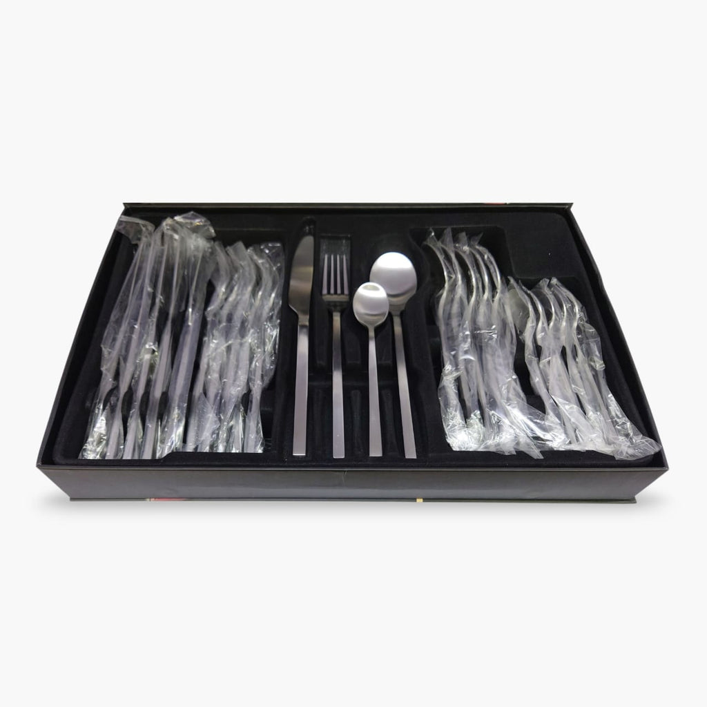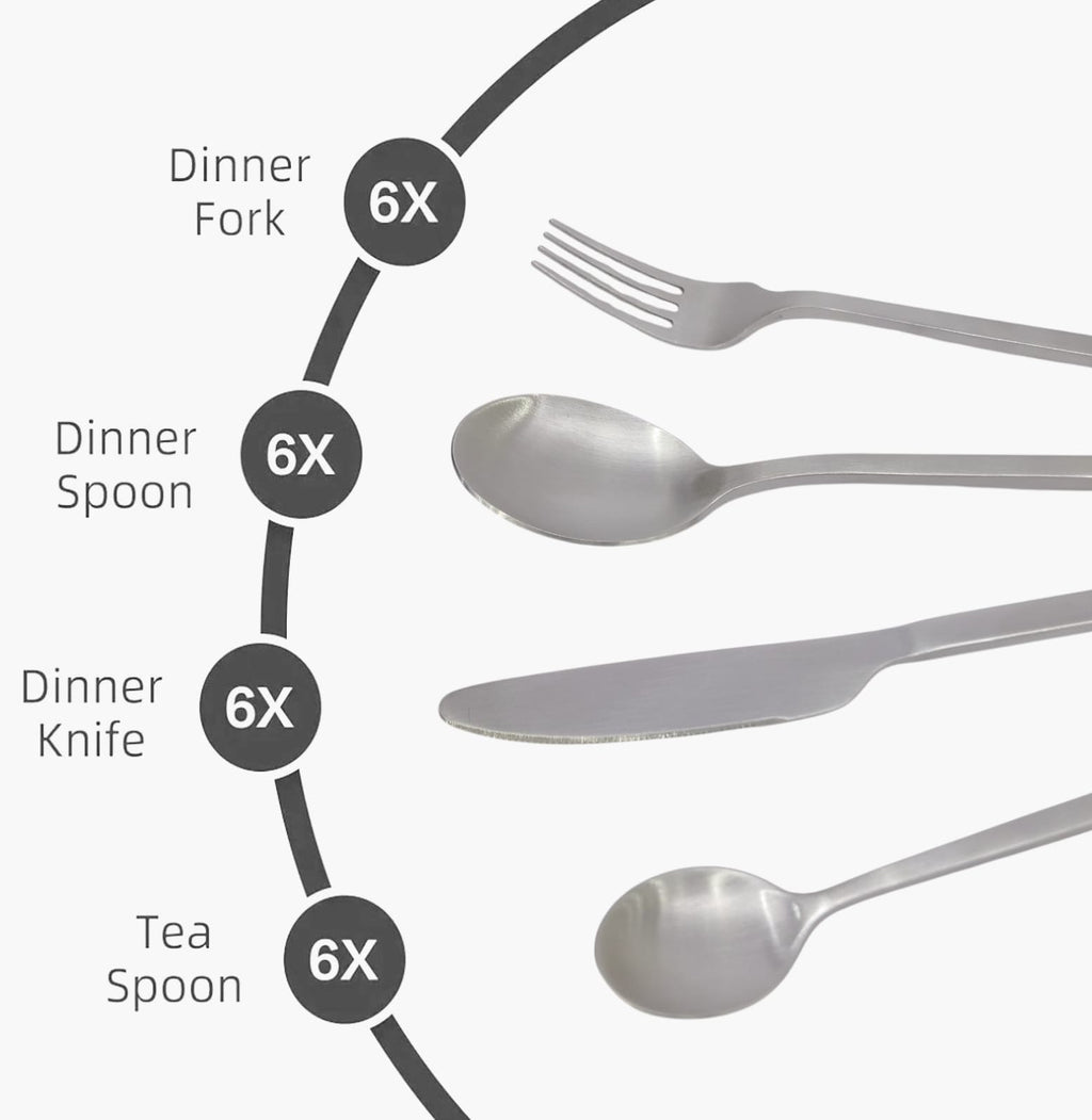 This 24-piece Alomi stainless steel cutlery set in silver includes six dinner spoons, six dinner forks, six teaspoons, and six dinner knives. Crafted from durable stainless steel, each piece offers long-lasting use and a sleek, polished finish that complements any table setting. Ideal for everyday dining or special occasions, this set provides a complete dining solution with balanced weight and ergonomic design for comfortable handling. Enhance your dining experience with reliable, stylish cutlery designed for both function and elegance.