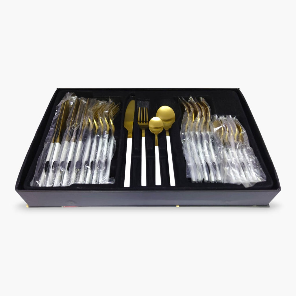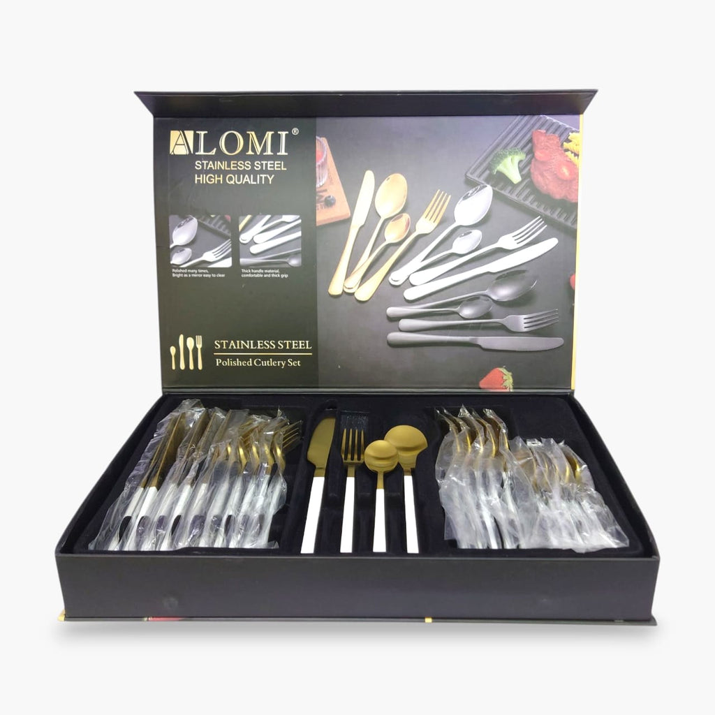 The 24-Piece Alomi Stainless Steel Cutlery Set in White with Golden accents offers a complete dining experience with six dinner spoons, forks, knives, and tea spoons. Crafted from durable stainless steel, this set combines elegance and functionality, enhancing your table setting while ensuring long-lasting use. Its balanced design provides comfort and precision for everyday meals or special occasions.
