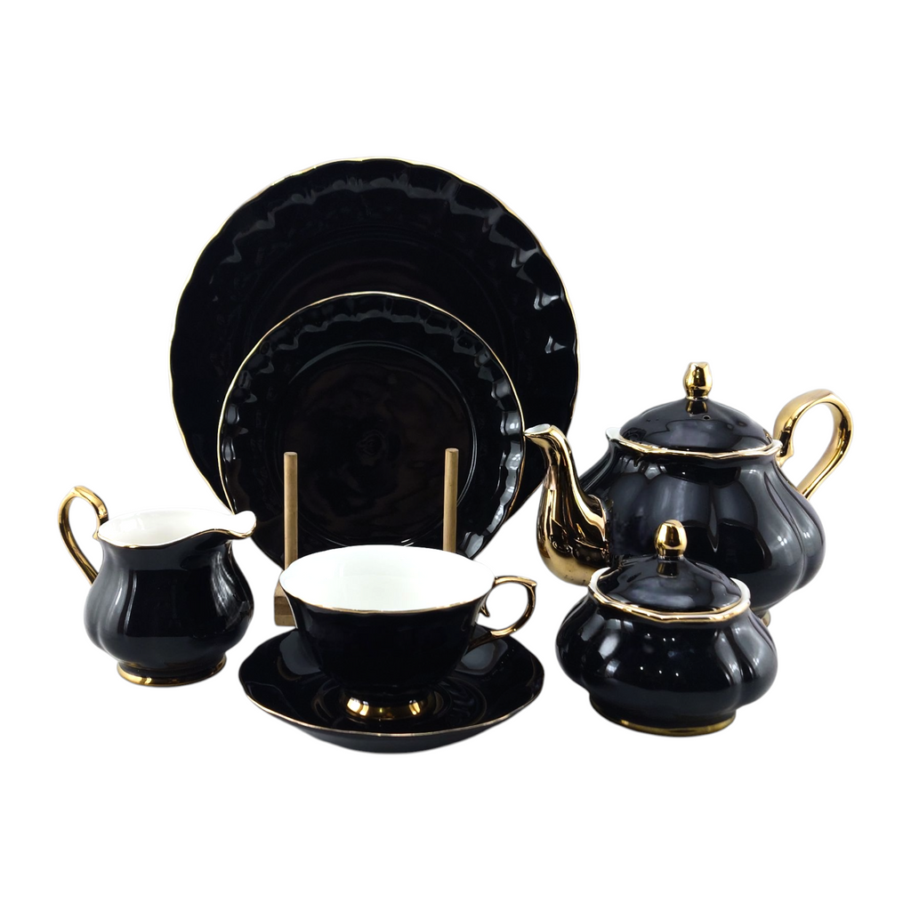 Elevate your tea service with this sophisticated 24-piece ceramic collection. Each piece features elegant black glazing complemented by refined golden outlines and handles, creating a cohesive, luxurious aesthetic.