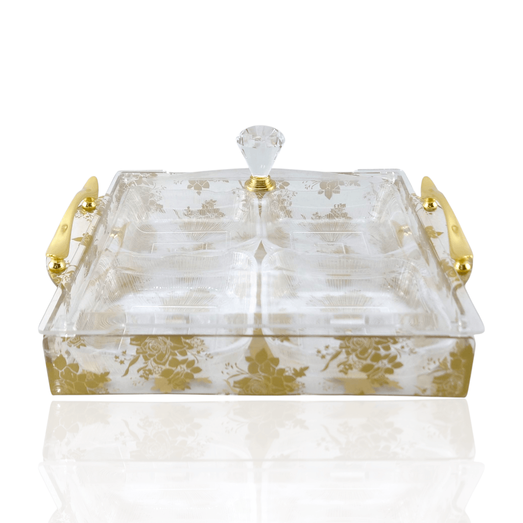 Elevate your dry fruit presentation with this sophisticated 4-portion acrylic square dish, featuring an elegant floral design. Crafted from durable acrylic, this versatile serving piece combines functionality with aesthetic appeal, making it ideal for entertaining guests or organizing your pantry. The divided compartments keep different varieties neatly separated while the decorative flowers add a refined touch to any table setting. Perfect for almonds, cashews, raisins, and more, this dish merges practicality with timeless style.