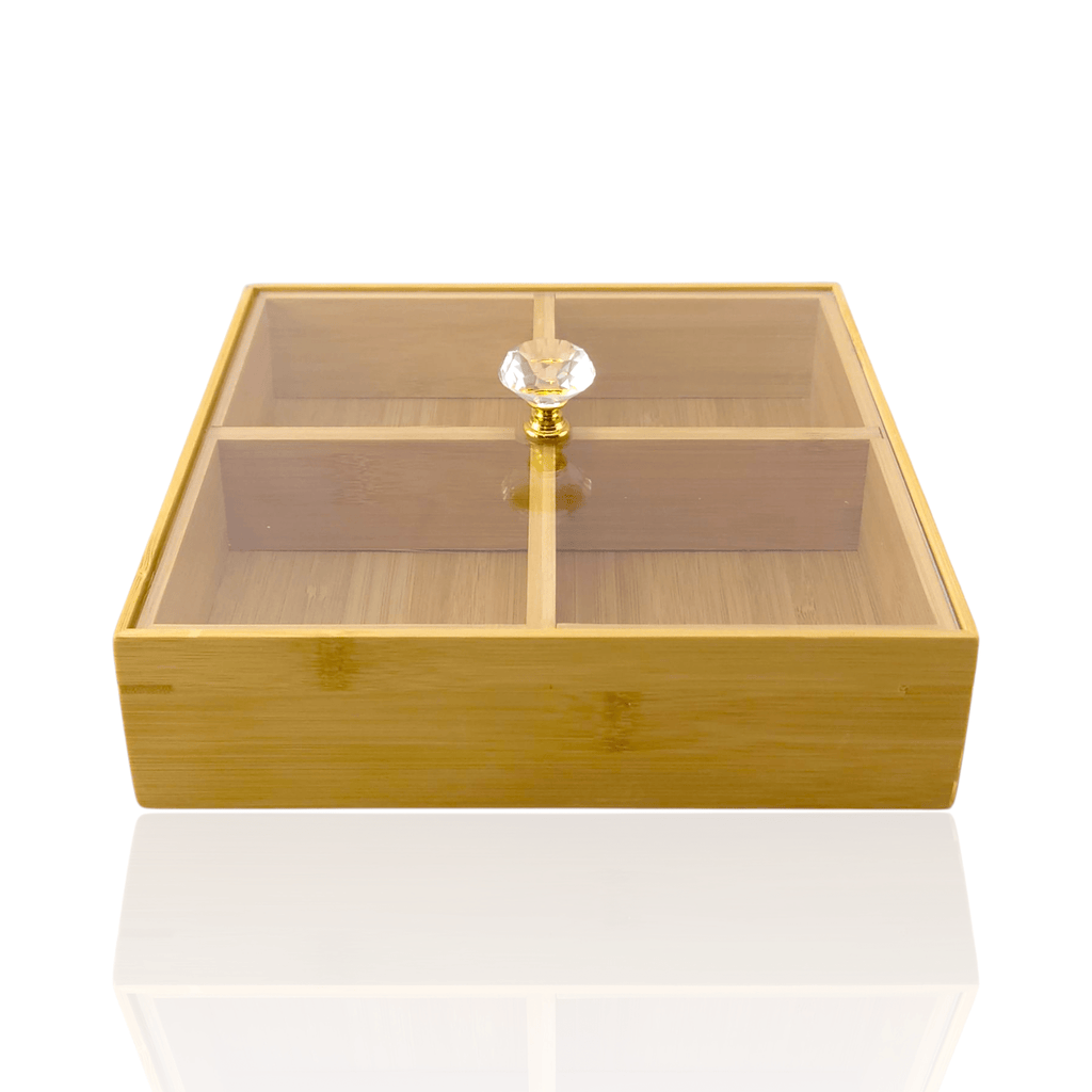 Elegantly serve and preserve your finest dry fruits with this sophisticated 4-portion wooden dish. Crafted from premium wood, each compartment accommodates different varieties while maintaining freshness and visual appeal. The transparent acrylic lid provides dust protection and allows guests to admire your selection at a glance. Perfect for entertaining, gifting, or everyday use, this piece combines functionality with timeless aesthetic appeal. An essential addition to any refined kitchen or dining collection.