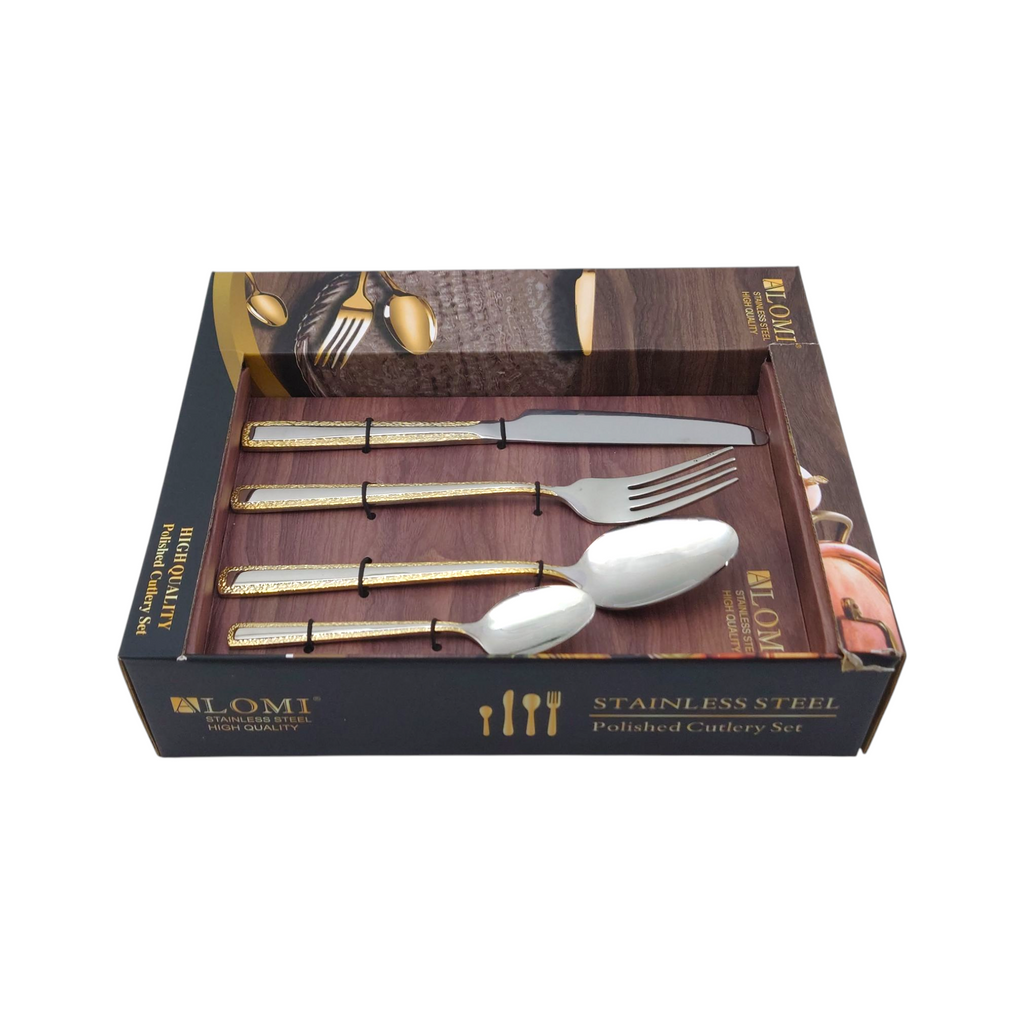 The Alomi 24-Piece Cutlery Set combines elegance and functionality with its stainless steel construction and sophisticated golden and silver design. It includes 6 table spoons, 6 tea spoons, 6 table forks, and 6 knives, all neatly organized on a durable stainless steel stand, perfect for display on dinner tables or shelves. Packaged in a sturdy box, this set is ideal for both everyday use and special occasions, offering durability and a touch of luxury to your dining experience.