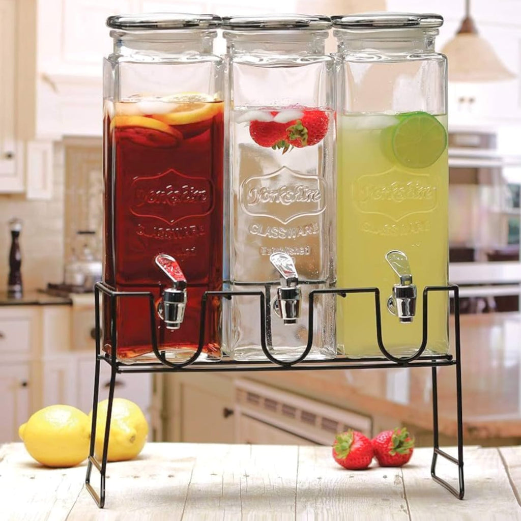 The Danny Home set includes three 2.3-litre glass beverage dispensers, each designed for easy serving and clear visibility of your drinks. Supported by a sturdy stainless steel stand, this setup enhances both functionality and presentation, making it ideal for gatherings or daily use. Durable glass construction ensures purity of flavor, while the elevated stand provides stability and convenient access. Perfect for serving multiple drink options in a stylish, organized way.