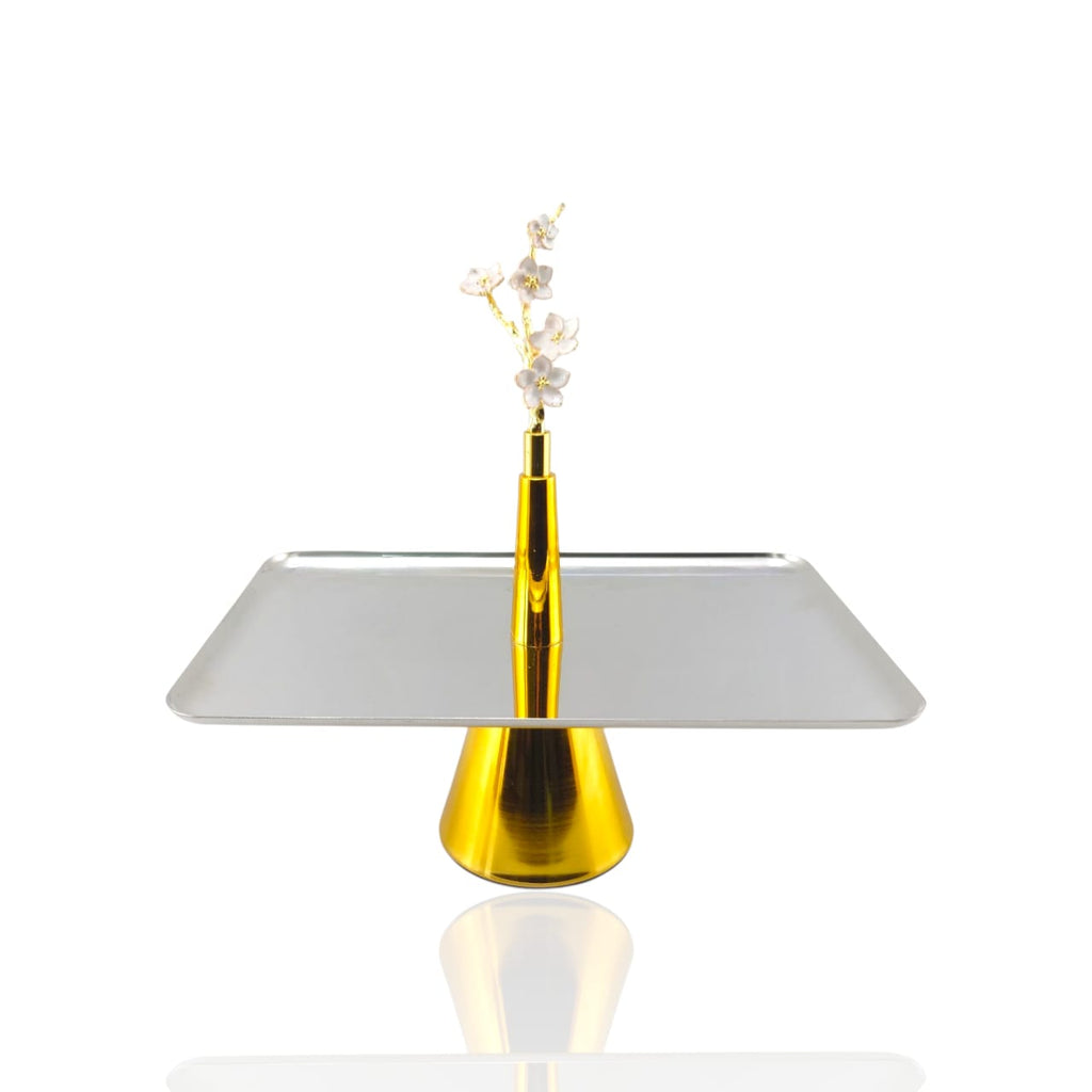 Elevate your dessert presentation with this Fancy Stainless Steel Rectangle Dessert Stand. Crafted from durable stainless steel, it features an elegant flower motif design on top that adds a refined touch to any setting. Its golden base enhances visual appeal while providing sturdy support. A built-in cushion underneath protects your table surfaces from scratches and ensures stability. Perfect for serving desserts, cupcakes, and pastries with style and sophistication.