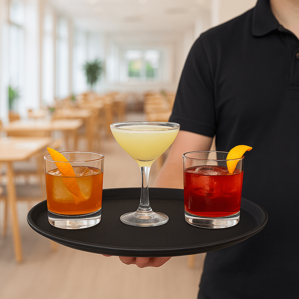 The Raffle Anti-Slip Round Black Serving Tray is expertly designed for bars and restaurants to ensure safe and efficient drink service. Crafted from durable plastic, it features a specialized non-slip mat on top that prevents glasses and bottles from sliding off, enhancing stability during busy service. Available in multiple sizes 28, 36, 40, and 44 cm, this tray adapts easily to various serving needs, combining practicality with reliability for professional environments.