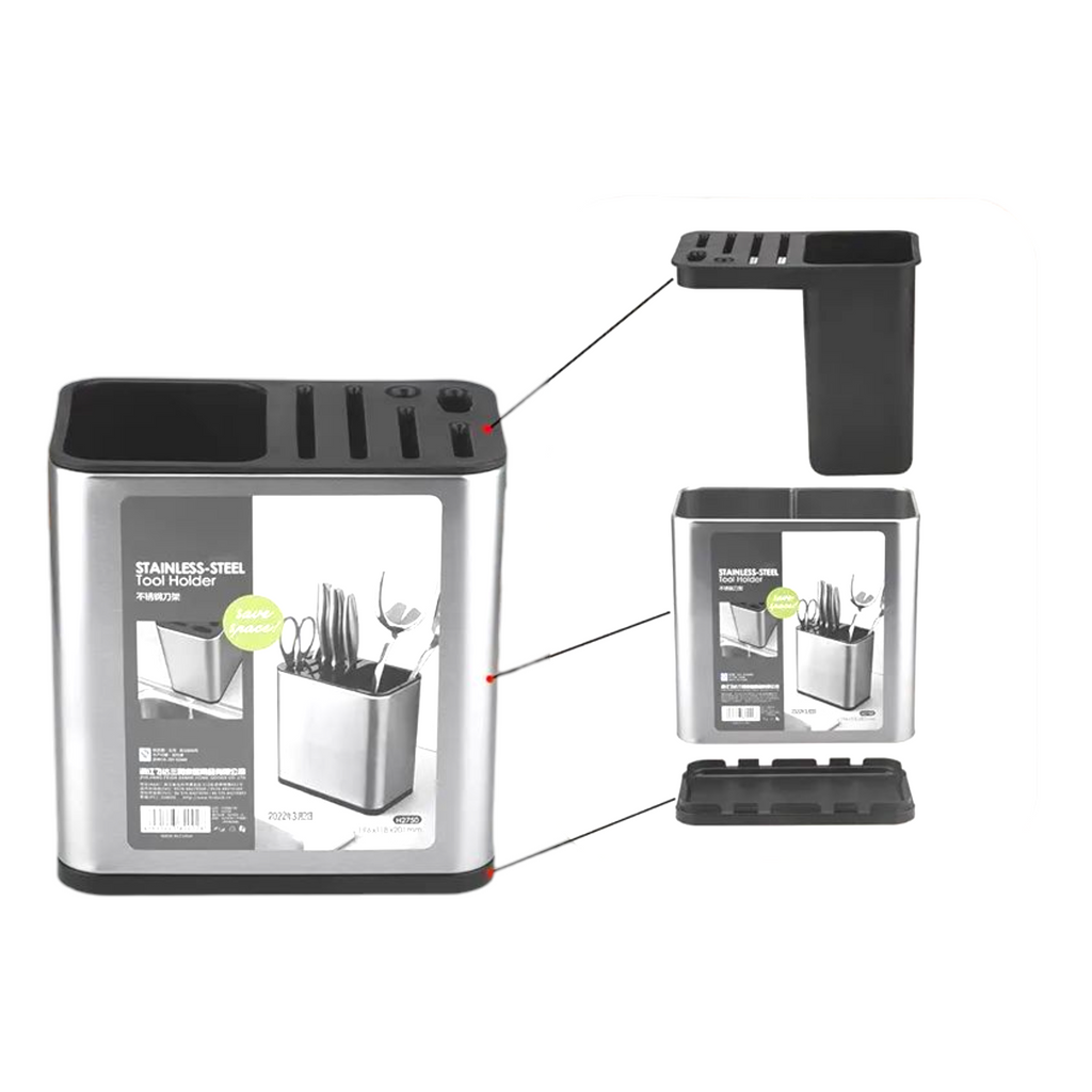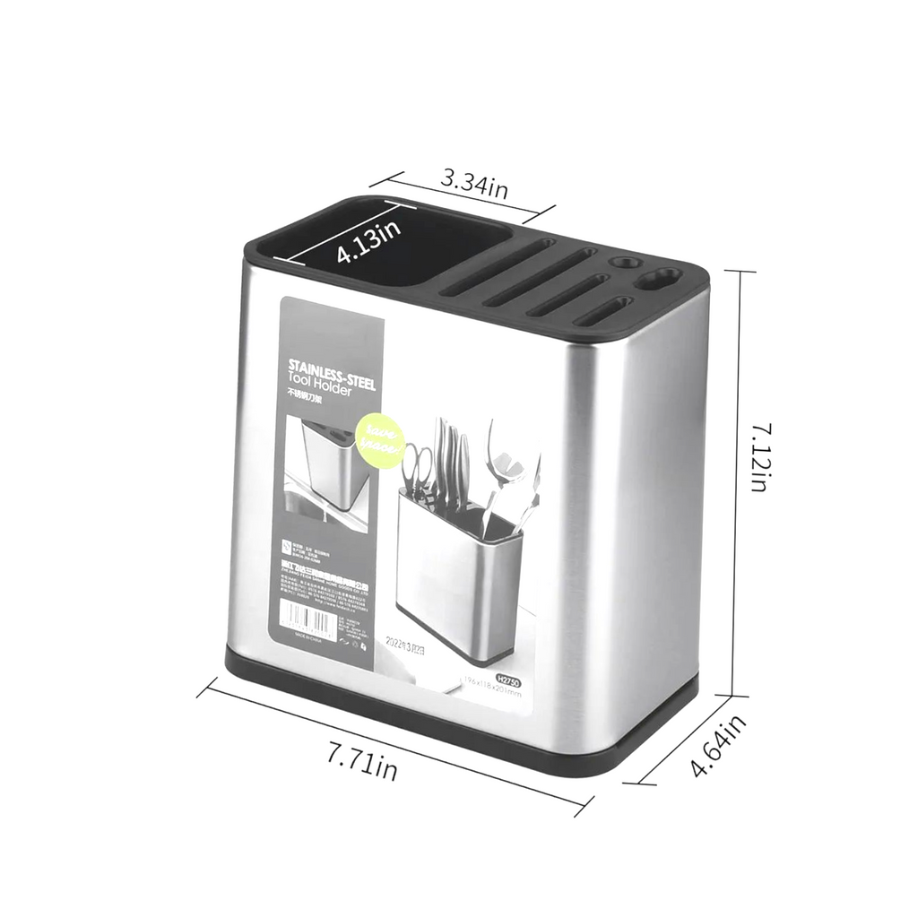 This 20x18 cm stainless steel cutlery holder efficiently organizes and dries a variety of utensils, including spoons, knives, sharpeners, and scissors. Equipped with drainage holes, it prevents water buildup, ensuring utensils stay dry and hygienic. Its durable design supports daily kitchen use while maintaining cleanliness and order.