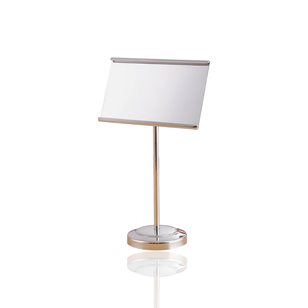 The Violet Silver Menu Stand is crafted from durable stainless steel, offering excellent resistance to rust and corrosion for long-lasting use. Designed for stability, it securely holds menu cards and information displays without tipping over. Ideal for restaurants, hotels, and buffet settings, this sleek stand is available in two sizes: 9x10 cm and 9x15 cm, allowing for versatile presentation options to suit various display needs.